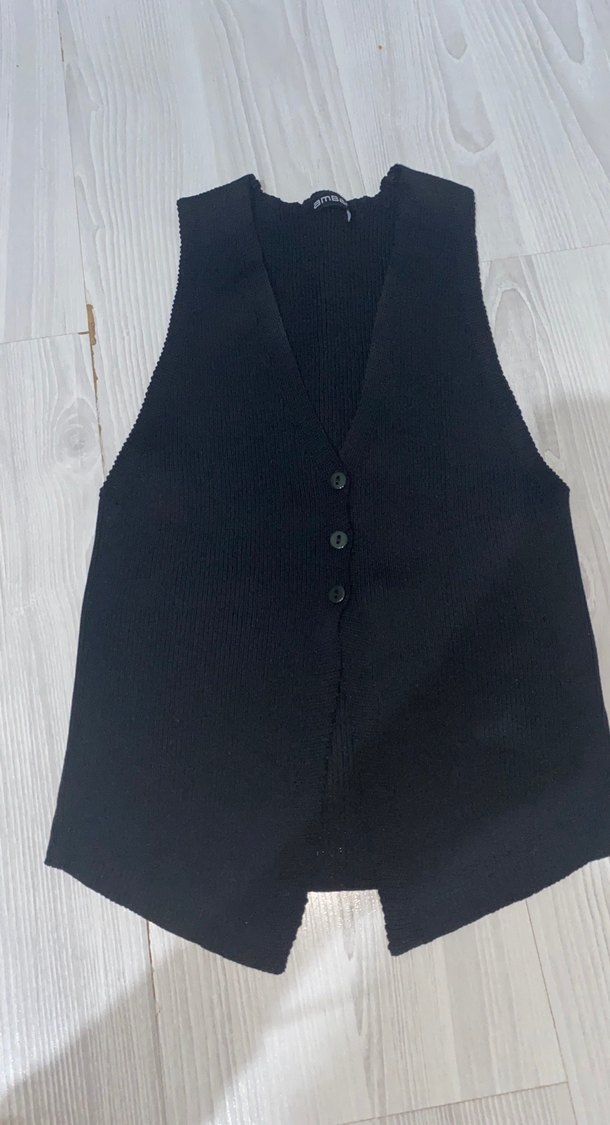 Düğmeli, kolsuz, siyah yelek. Notlu yakalı, midi boyda ve regular fit kesim. Günlük kullanıma uygun rahat model.