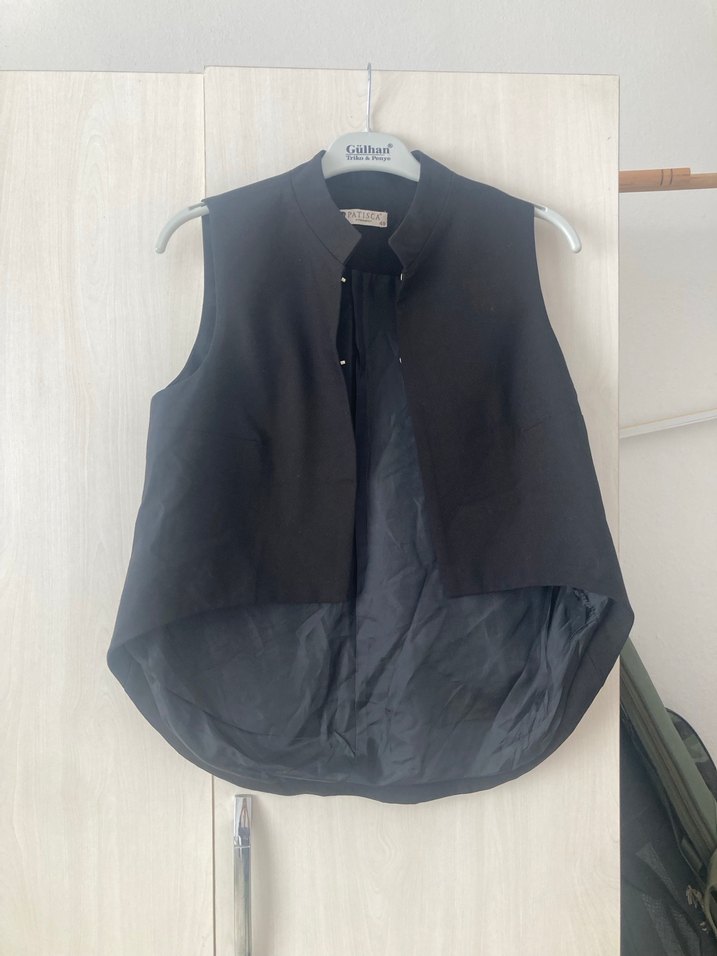 Düğmeli, yakalı, siyah kolsuz midi yelek. Sentetik kumaştan, regular fit ve minimalist goth tarzında, ofis için uygun. 40 beden yazıyor ama 36 olur