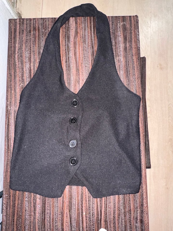 Siyah kolsuz yelek, düğmeli ve kesik yaka detayına sahiptir. Yumuşak sentetik kumaştan üretilmiş, normal kesim ve midi boyda, günlük kullanıma uygundur.