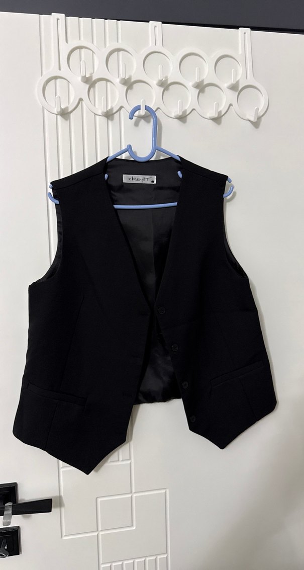 Düğmeli, kolsuz ve siyah renkte olan bu yelek, kesik yaka ve midi boyda. İş ortamı için klasik goth tarzında, rahat bir kesime sahip.