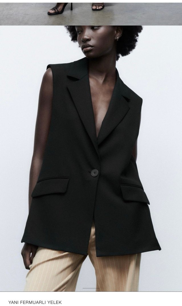 Düğmeli siyah kolsuz blazer, kesik yakalı ve tek düğmeli. Regular fit, iki ön cepli, ofis için uygun. Pürüzsüz sentetik kumaştan, modern sokak stili.