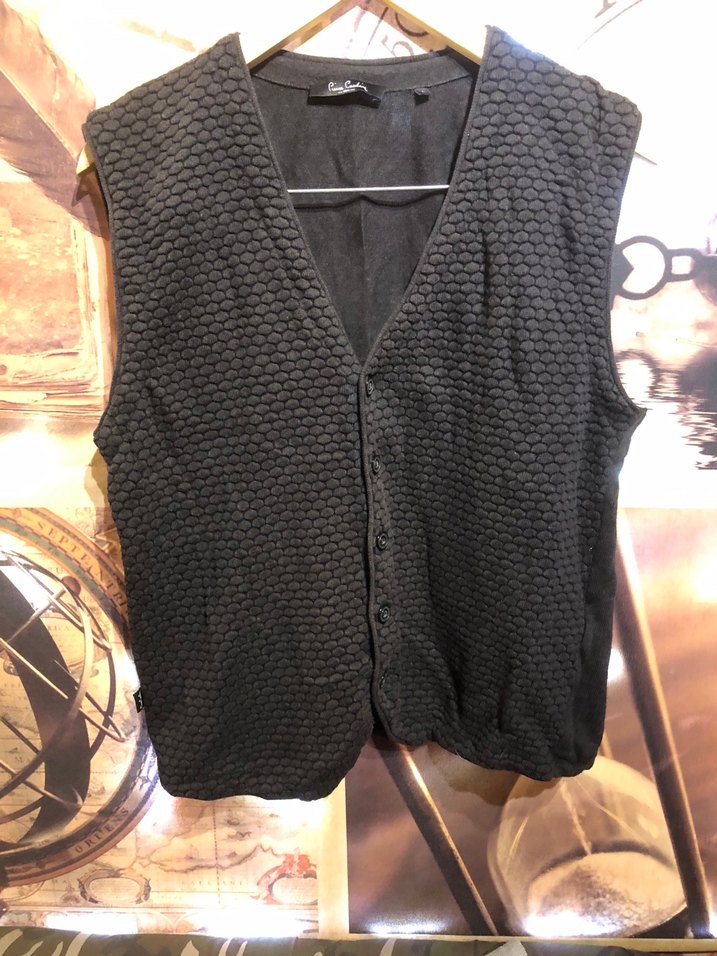 Pamuklu kumaştan, düğmeli ve V yakalı siyah kolsuz yelek. Normal uzunlukta ve dar kesim, günlük rahat sokak stili için uygundur.