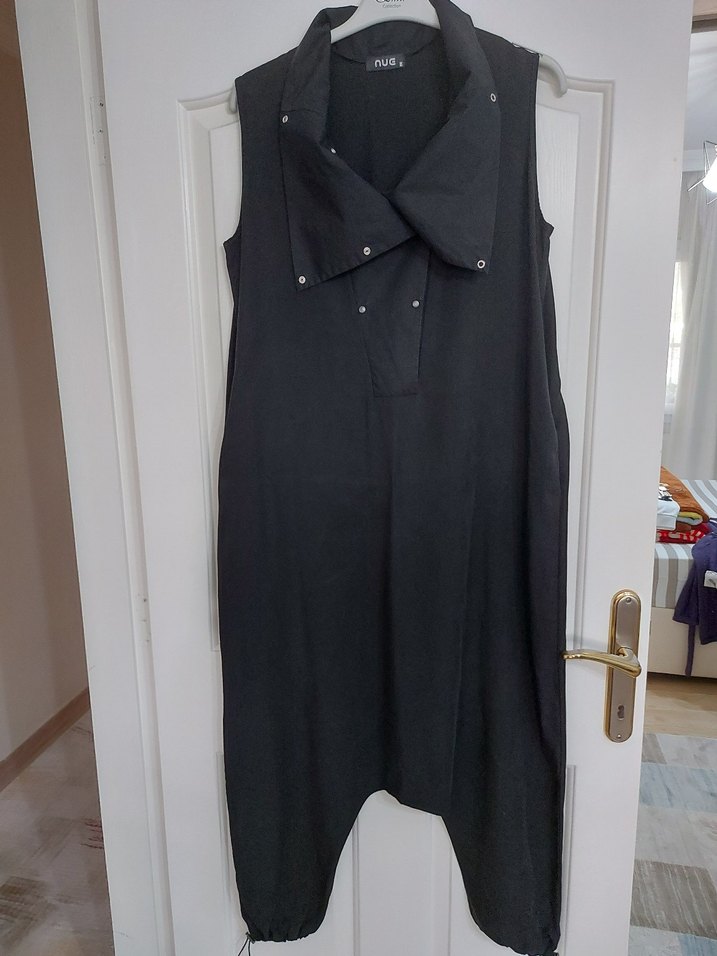 Keten kumaştan, düğmeli ve yakalı siyah kolsuz tulum Gevşek kesimi ve uzun boyu ile avant-garde tarz sunar.