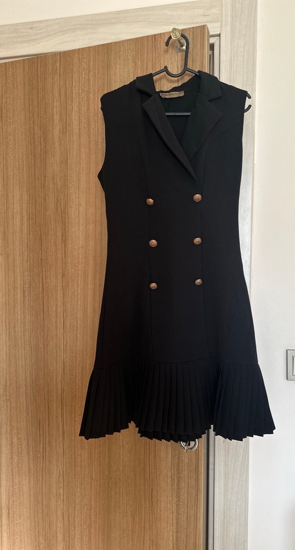 Düğmeli ve kolsuz uzun kadın elbise, keskin yaka ve pilili etek ucu ile ofis şıklığı sunar. Düz siyah, klasik zarif tarzda, sentetik kumaştan.