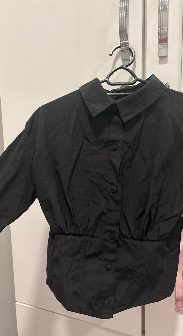 Düğmeli, yakalı ve uzun kollu siyah keten gömlek, vücuda oturan midi uzunlukta, minimalist tarzda günlük kullanıma uygun. Belinin sırt kısmı ipli değil, lastiklidir bu sebeple esneme payı vardır.