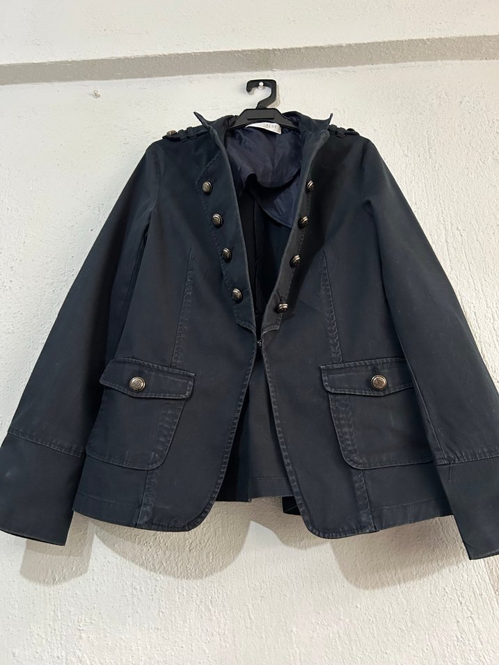 Düğmeli, siyah kot ceket, regular fit ve strappy kollu. Ofis için uygun, Paris sokak stilinden esinlenmiş.