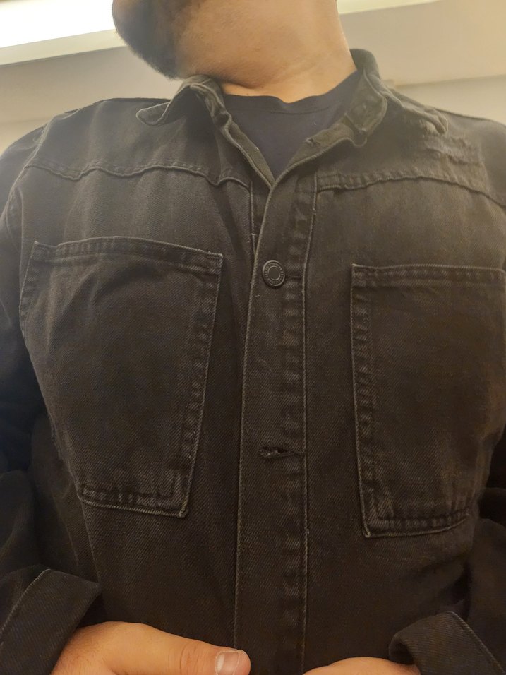 Gömlek modelinde ama kumaşı kalın düğmeli, siyah kot kumaştan yapılmış erkek ceketi. Notlu yaka, uzun kollu ve rahat kesim, günlük spor stil için uygundur.Temiz ürün 2 kez kullanılmıştır.