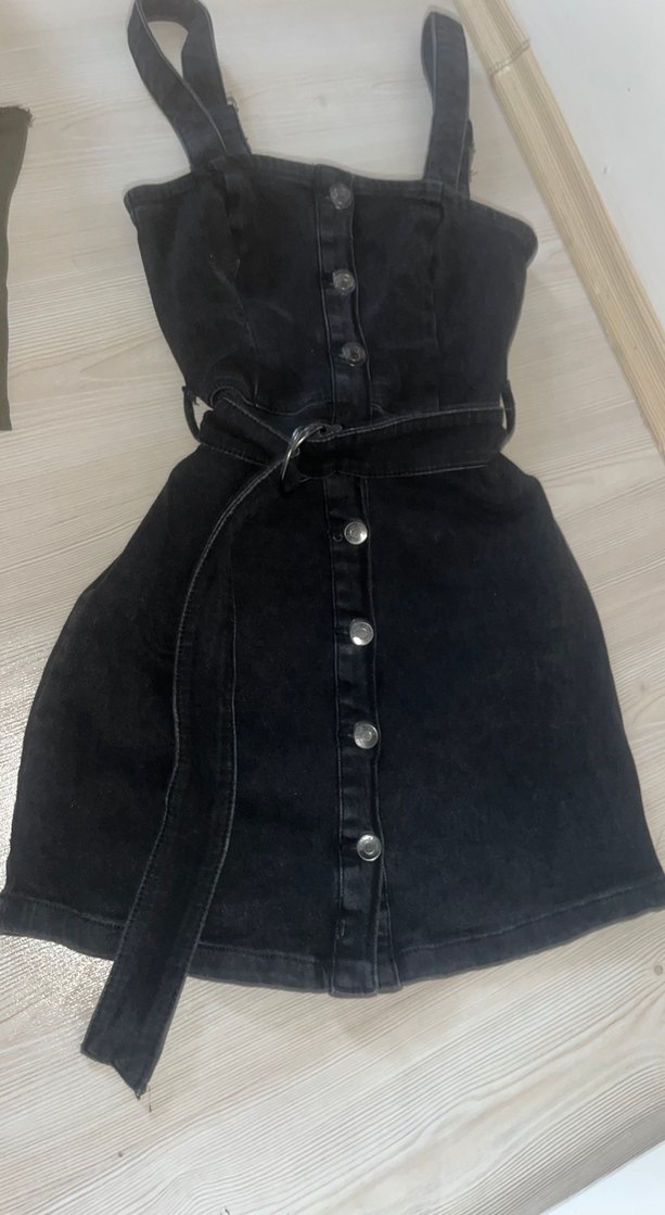 Siyah kot kumaştan, düğmeli, halter yakalı ve askılı midi elbise. Belde kemer detaylı, vücuda oturan kesime sahip, günlük kullanıma uygun.