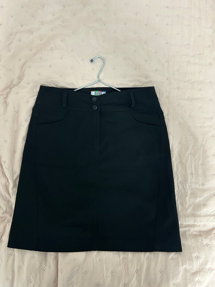 Düğmeli, düz siyah etek, rahat kesimi ve sentetik kumaş. Rahat kumaş
