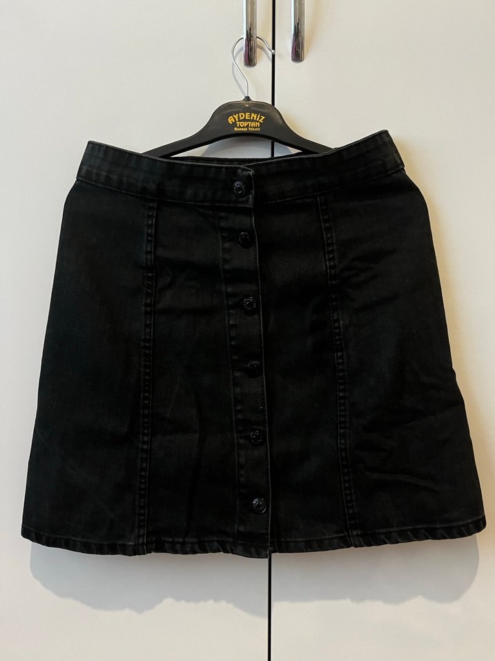 Siyah kot kumaştan yapılmış, düğmeli ön ve bol kesime sahip mini etek. Günlük kullanıma uygun, desen içermeyen normal boyda etek.