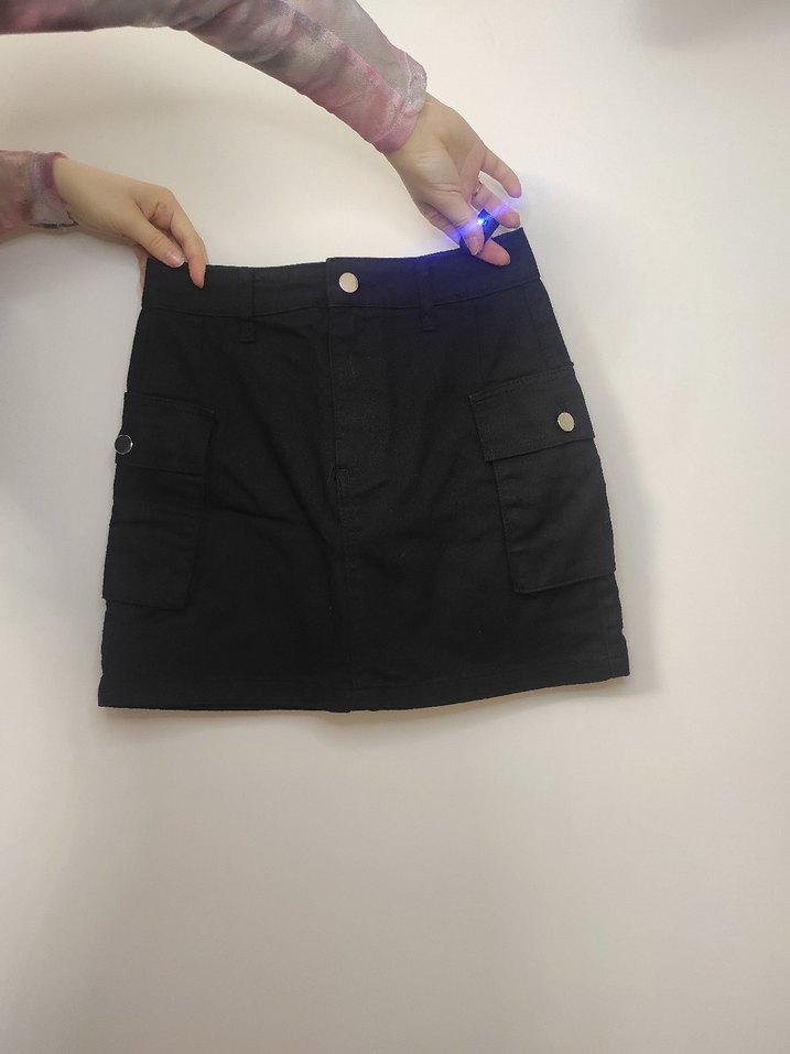 Düğmeli siyah mini kot etek, vücuda oturan kesimle gotik tarzı yansıtıyor. ✨
