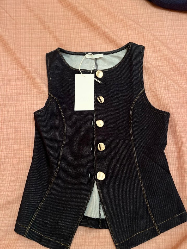 Düğmeli, siyah kot kumaştan yapılmış, normal midi boyda ve yakası kesimli, vücuda oturan yelek. Günlük kullanıma uygundur.