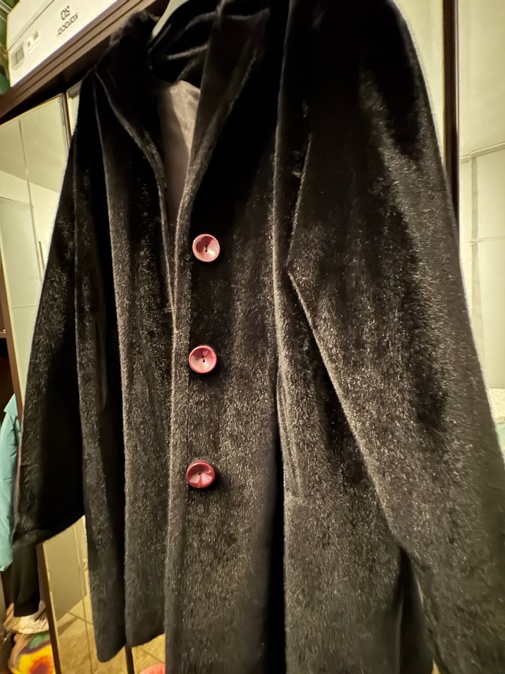 Düğmeli, siyah kürk uzun kaban.Notlu yaka ve bol kesim, uzun kollu, ofis kullanımına uygun.50 beden