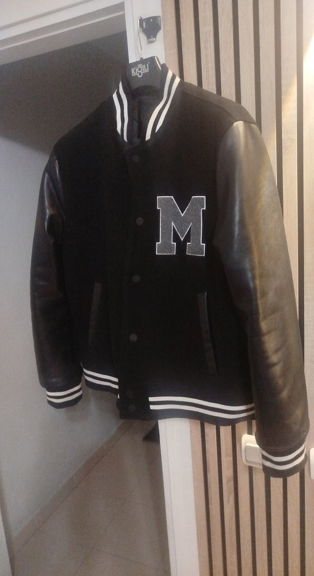 Düğmeli, uzun kollu, siyah fitted deri kollu ceket. Notlu yaka ve baskılı 'M' detayı bulunur. Spor tarz için uygundur.