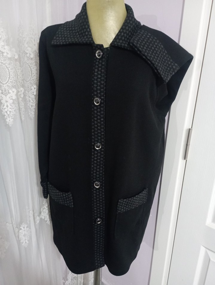 Düğmeli, kesik yakalı siyah midi büyük beden ceket. Uzun kollu, regular fit ve ofis için uygun. Triko tarzı kumaştan, desensiz, gotik iş tarzında.#siyah #bayan #ceket #kaban #triko #cepli
