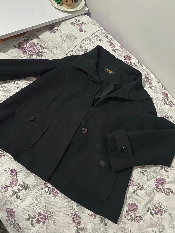 Düğmeli ön ve kesik yaka detaylı siyah hamile ceketi. Uzun kollu, bol kesim ve sentetik kumaştan, ofis kullanımı için uygun.