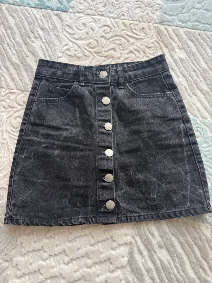 Düğmeli önde, hafif batik desenli siyah denim etek. Normal midi boyda, dar kesim ve ceplidir. Günlük sokak stiline uygundur. XS - S beden ile uyumlu. Defosuz. Detayları fotolarda gösterdim. Dolap küçülttüğüm için satıyorum