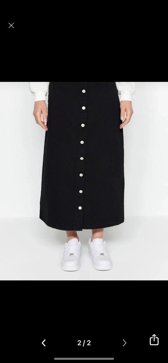 Düğmeli ön kısmı ve bol kesimi ile siyah midi denim etek, günlük rahat kullanım için uygun minimalist ve sokak tarzı bir üründür.
