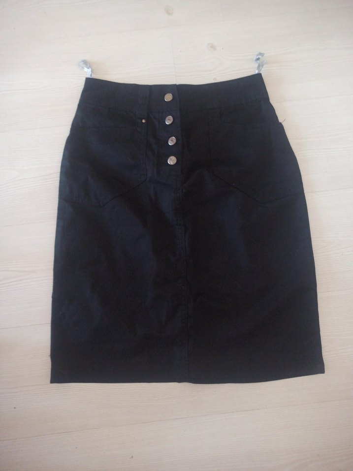 Düğmeli ön kısmı ve midi boyu ile siyah denim kalem etek, günlük kullanım için uygun ve gotik tarzda.