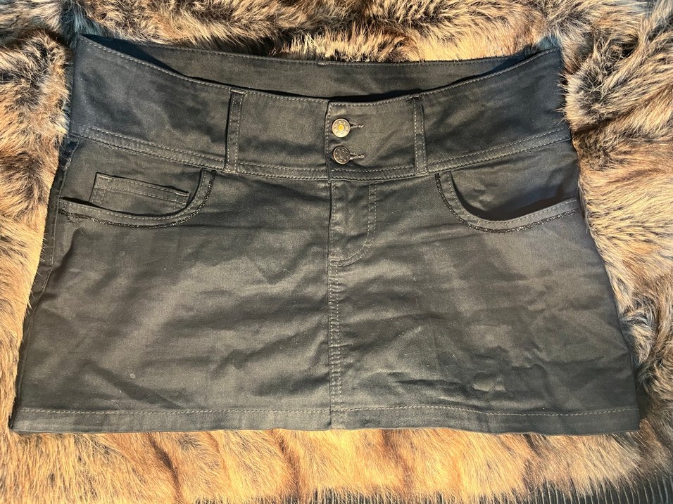Düğmeli ön kısmı ve normal midi boyuyla siyah, fitted denim mini etek. Grunge punk tarzını yansıtarak dış mekan kullanımı için uygundur.