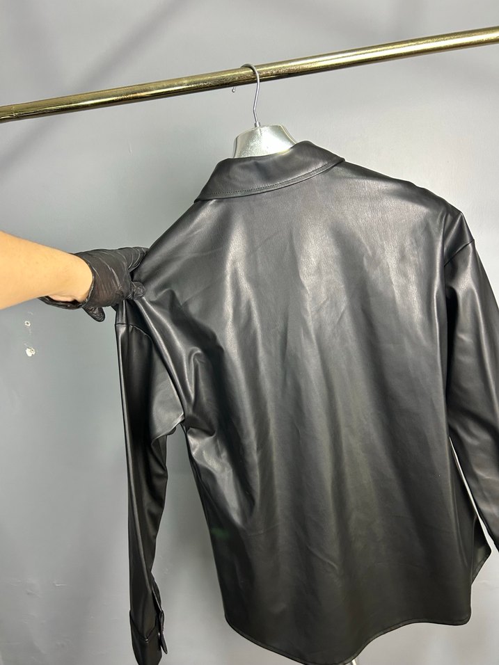 Düğmeli, yakalı ve uzun kollu bu parlak siyah deri ceket, midi boyda ve regular fit kesimdedir. Sokak stili için uygundur.