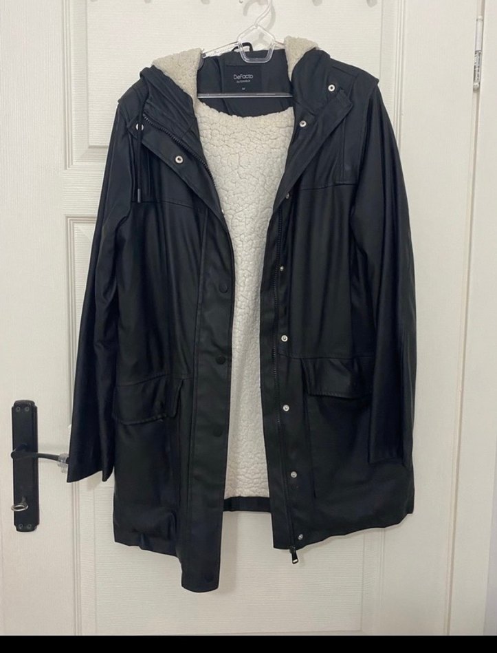 Düğmeli kapamalı, notched lapel yaka ve uzun kollu siyah deri kadın ceket. Midi boy, bol kesim ve yumuşak iç astar ile günlük kullanıma uygun minimalist tarzda.