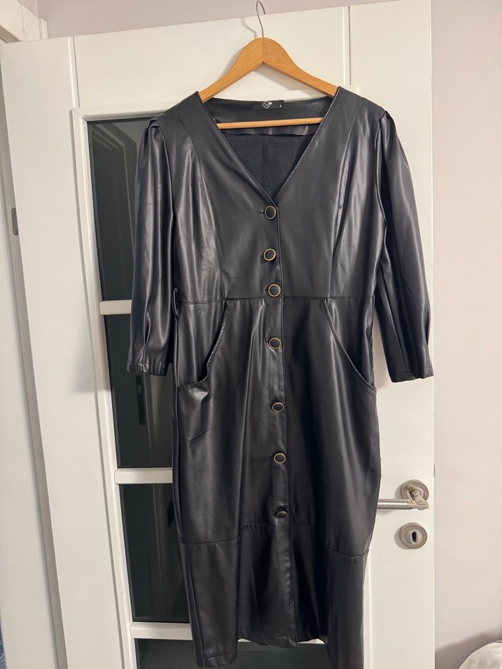 Düğmeli Siyah Midi Deri Kadın elbise