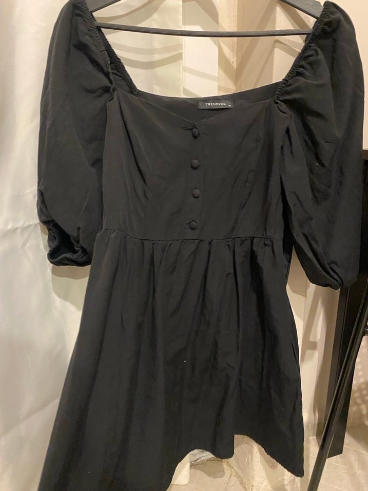Düğmeli siyah midi elbise, tekne yaka ve kısa balon kolludur. Keten kumaştan, bol kesim ve gotik Paris tarzına uygun.
