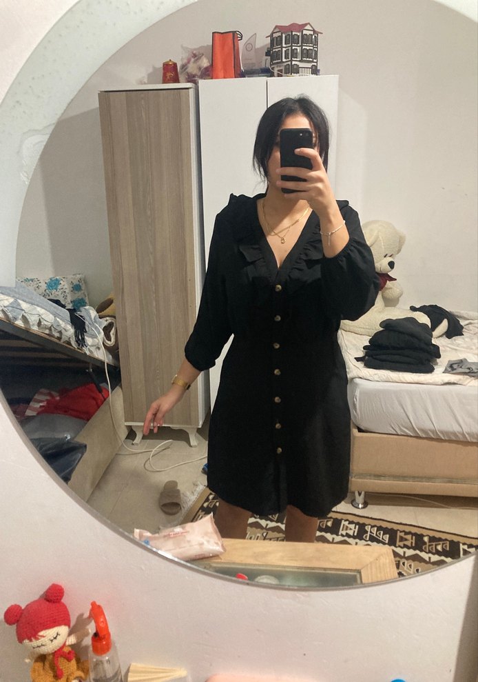 Düğmeli siyah midi elbise, uzun kollu ve V yakalıdır. Rahat kesimi ve ipeksi kumaşıyla günlük kullanıma uygundur.