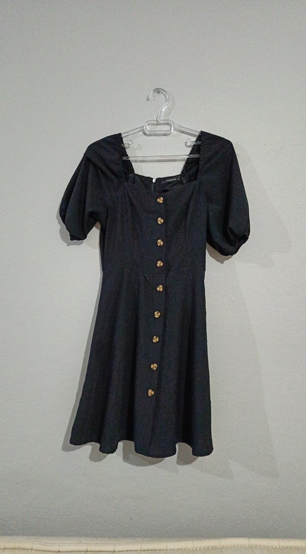 Siyah midi elbise, tek sıra düğmeli, kısa kollu ve kayık yaka tasarıma sahip, rahat kesimdir. Ürünün gövde ve etek kısmının birleşim yerinde görselde göründüğü gibi bir dikiş hatası mevcut. Bedeni etikette 34 görünüyor ancak 36 bedene de olacağını düşünüyorum.