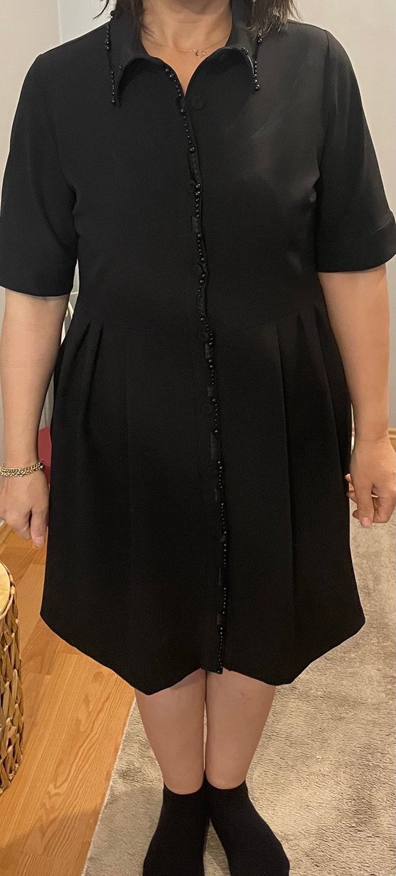 Düğmeli, kısa kollu, yakalı ve parlak siyah midi elbise, vücuda oturan kesimiyle şık bir görünüm sunar. Sadece 2 kez kullandım. 44/46 için uygundur. ZARA/Love My Body ürünüdür