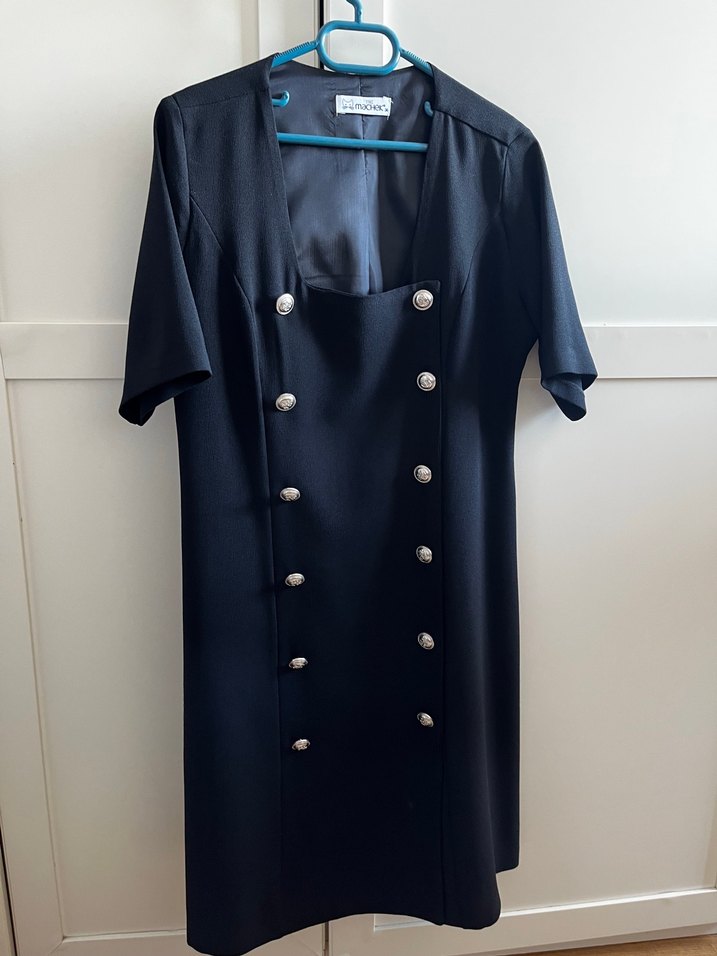 Düğmeli, siyah midi elbise, kısa kollu ve yakasında kesik yaka bulunur. Normal kesim ve klasik şıklık sunar, ofis için uygundur.