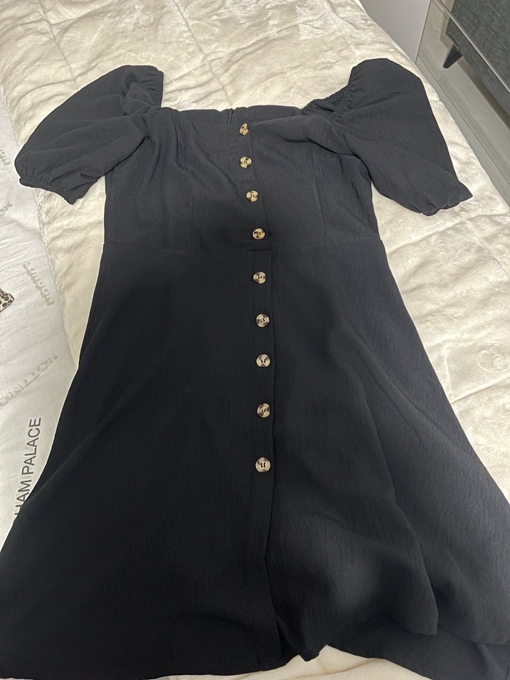 Siyah midi elbise, tönü düğmeli, kabarık kollu. Rahat kesim ve yumuşak sentetik kumaştan, günlük kullanıma uygun. Paris tarzı