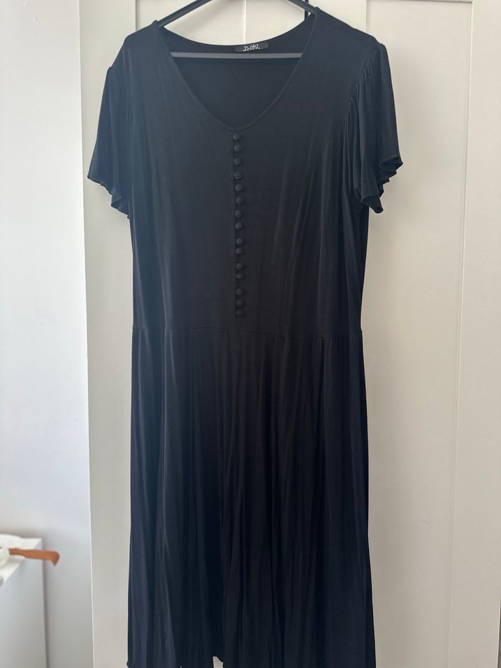 Siyah midi uzunlukta, kısa kollu ve V yakalı elbise.Yumuşak penye kumaştan üretilmiş, düğmeli ve bol kesimli, günlük kullanıma uygun gotik tarzda.
