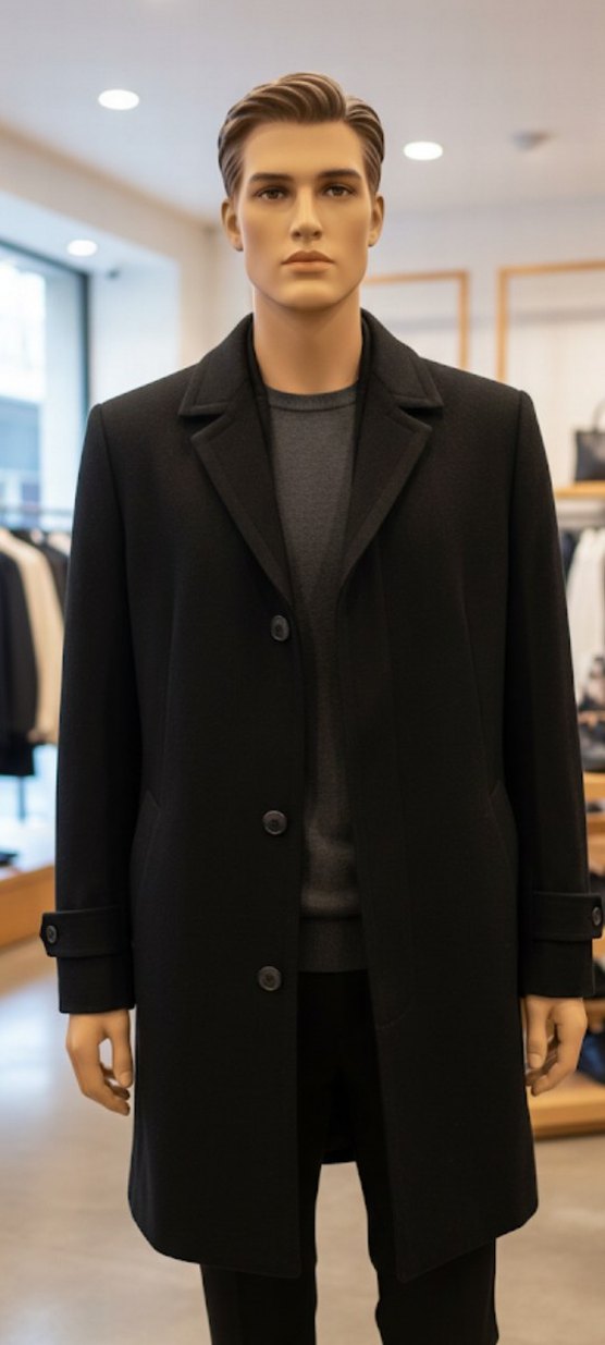 Düğmeli, siyah renkte, normal boyda erkek kaban. Notch yaka ve uzun kolludur. Yumuşak ve sıcak kumaştan üretilmiştir, ofis kullanımı için uygundur.