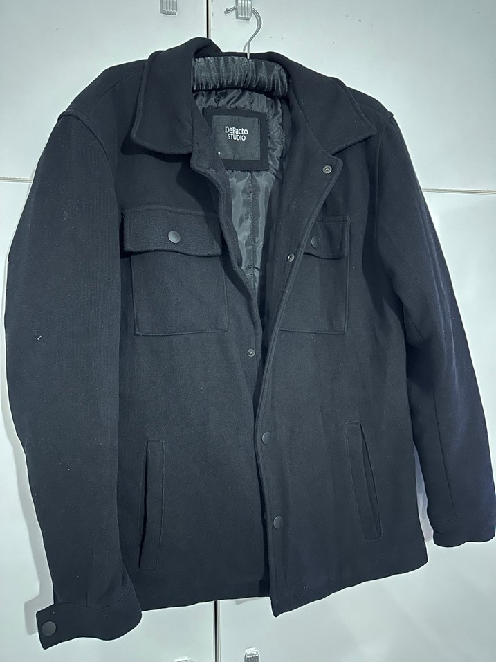 Düğmeli önü ve kesilmiş yakasıyla siyah erkek kaban, normal kesim ve uzun kolludur. Yumuşak ve sıcak kumaşıyla ofis ve günlük şıklık için uygundur. Süettir