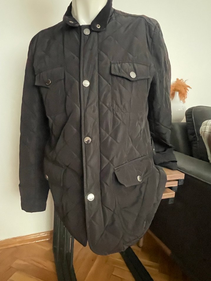 Düğmeli, siyah, midi uzunlukta erkek mont. Notch yaka ve uzun kollu, sentetik kumaştan, günlük kullanıma uygun rahat kesim.