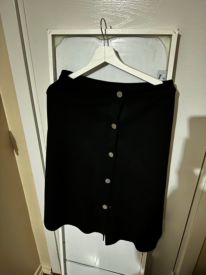 Düğmeli, siyah renkli,bol kesim midi etek Minimalist ve gotik tarzda, günlük kullanım için uygundur.
