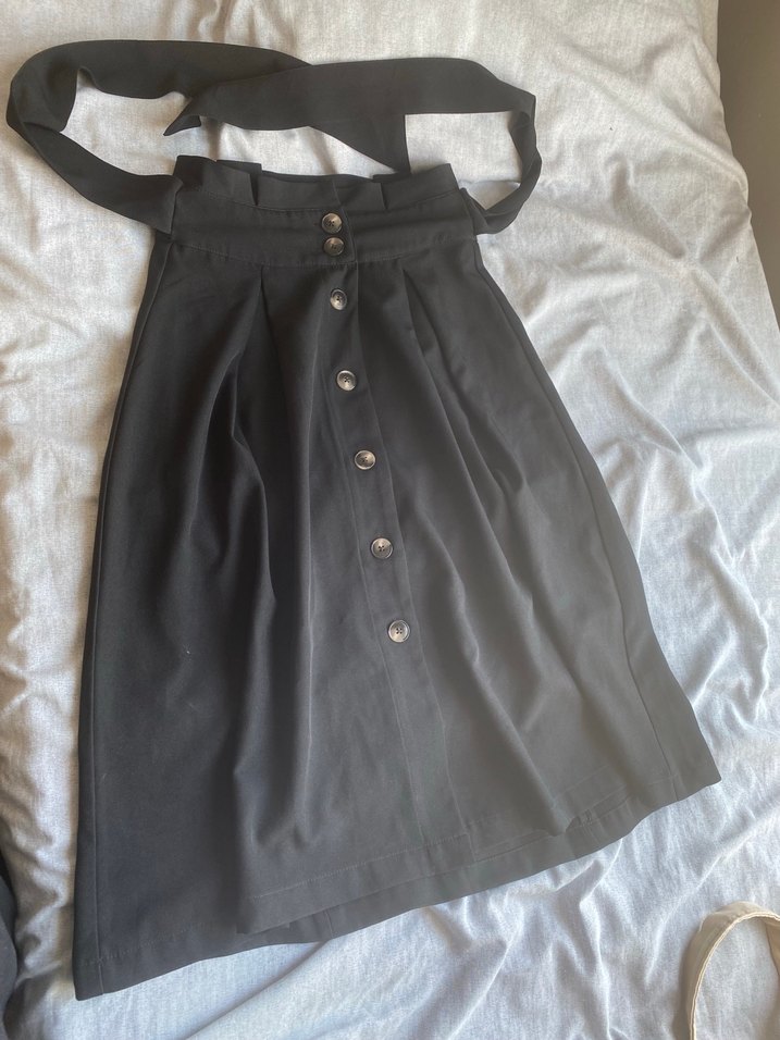 Düğmeli ve kuşaklı, siyah midi uzunlukta, bol kesim etek. Yumuşak sentetik kumaştan, günlük gotik tarz için uygun.