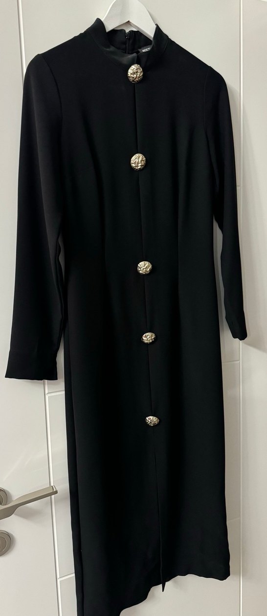 Düğmeli ön kısmı ve kesimli yaka detayıyla siyah midi elbise. İpek gibi kumaş, uzun kollu ve klasik bir elbise ön yırtmacı mevcut, arka fermuarlı şık bir elbisedir . Sadece bir kere giyinildi .