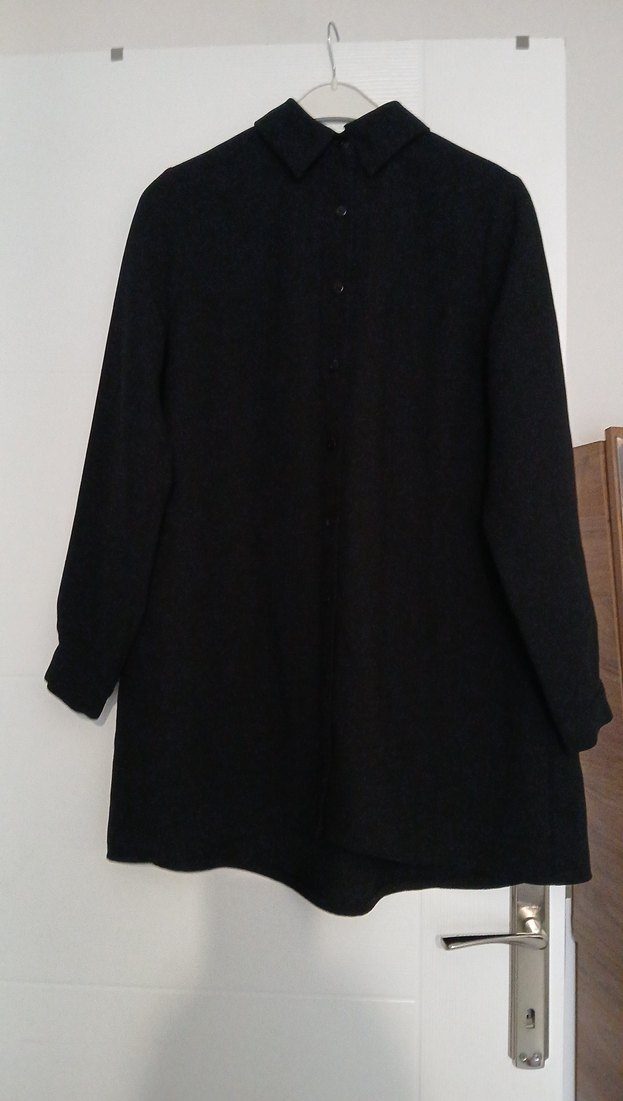 Siyah yün kumaştan yapılmış, düğmeli ve notlu yaka detaylı, bol kesim midi boy. Ofis kullanımı için uygundur.