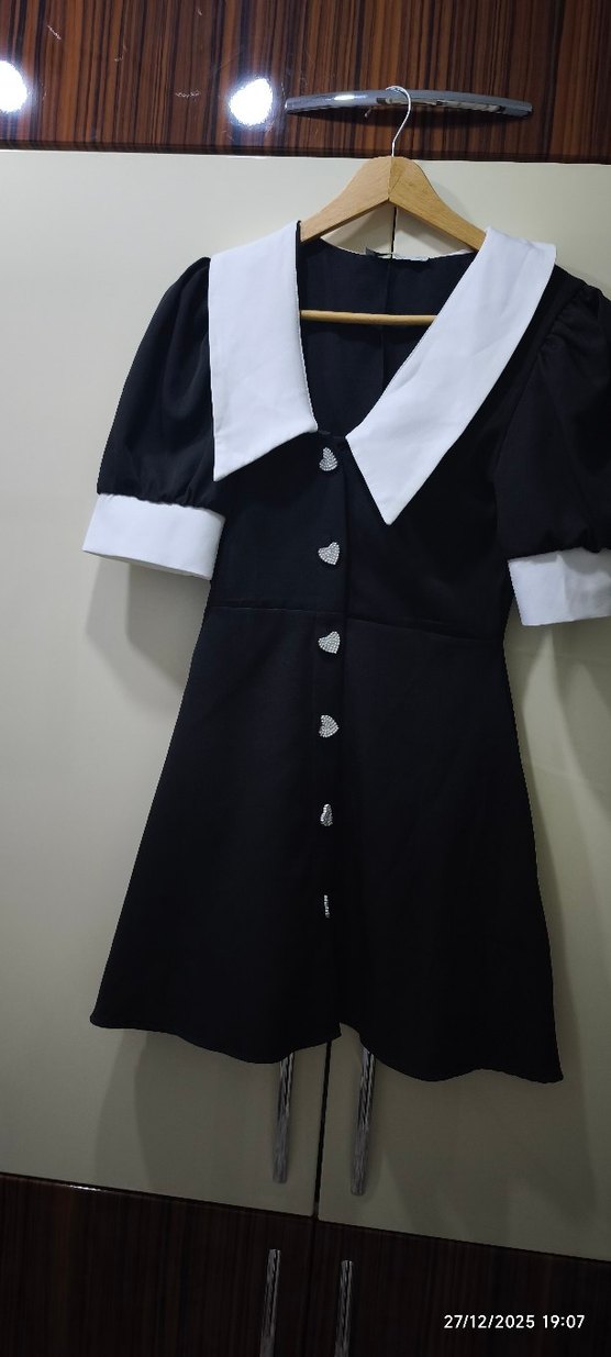 Düğmeli, yakalı ve kalp şeklinde düğmelerle süslenmiş siyah midi elbise, gotik tarzı ofis şıklığıyla buluşturuyor.