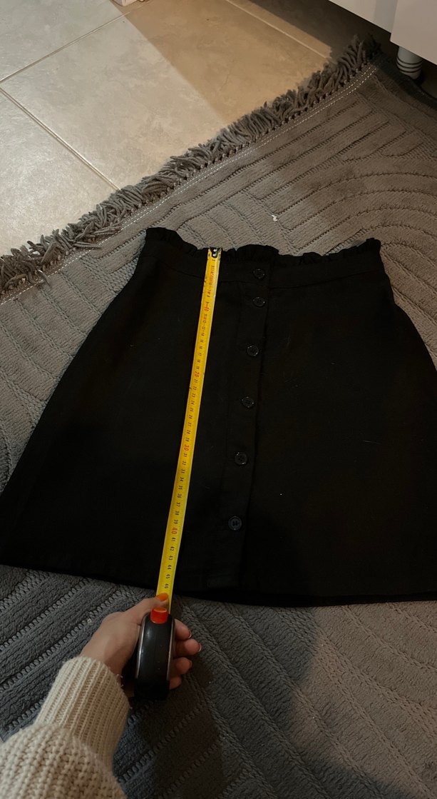 Düğmeli, siyah midi etek, bol kesim ve sentetik kumaştan. tarzıyla dış mekan kullanımı için uygundur.