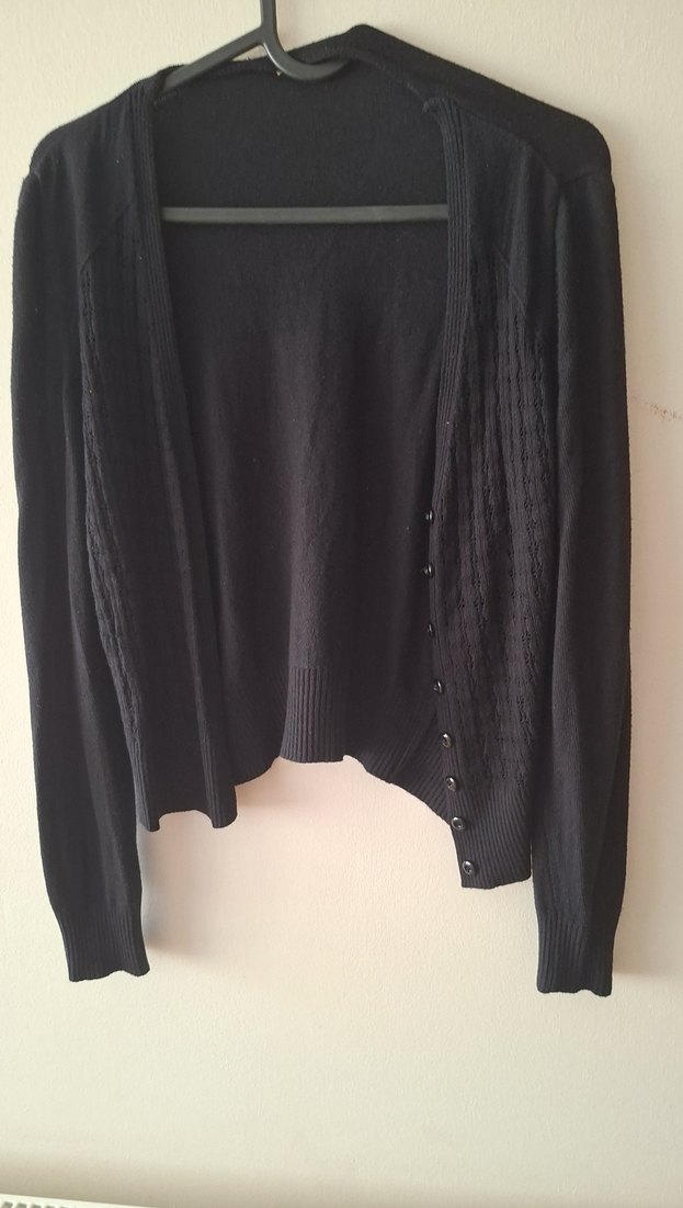 Düğmeli, uzun kollu, V yakalı siyah triko hırka. Midi boyda, fitted kesim ve goth tarzında, günlük kullanıma uygun.