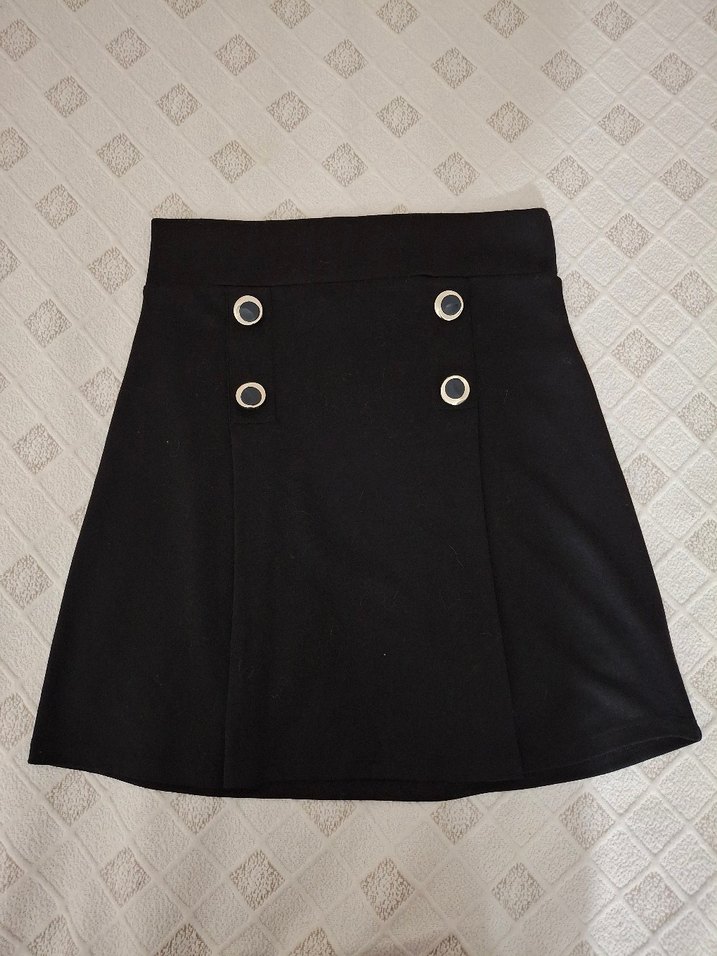 Düğmeli detaylara sahip siyah midi mini etek, sentetik kumaştan ve normal kesim. Günlük kullanım için uygun gotik tarzda.