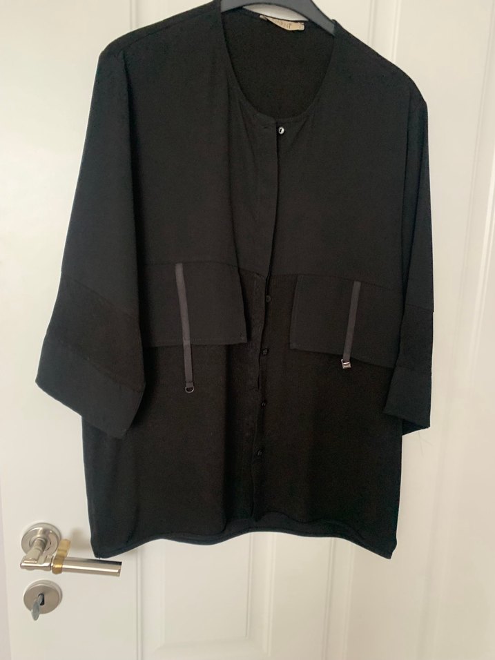 Siyah, düğmeli, midi uzunlukta, uzun kollu ve notched lapel yakalı hamile ceketi. Rahat kesimli ve ipeksi dokuda, günlük sokak stili için uygun.