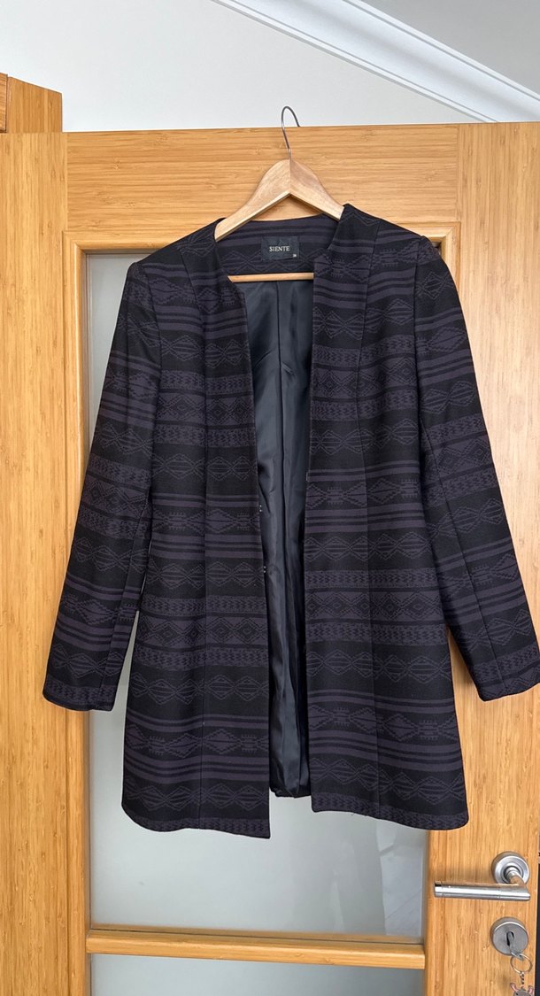 Düğmeli, siyah midi hamile ceketi, notched lapel yakalı ve uzun kolludur. Regular fit ve sentetik kumaştan yapılmıştır, ofis kullanımı için uygundur.