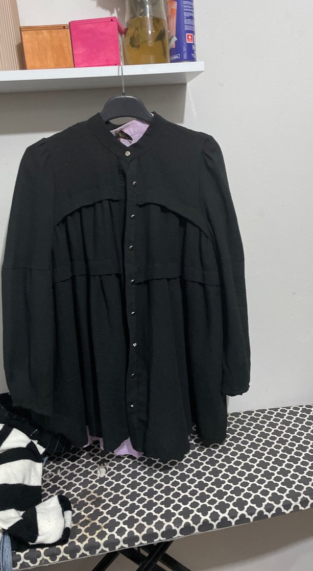 Düğmeli, yüksek yakalı ve uzun kollu siyah hamile ceketi. Keten kumaştan, midi boyda ve bol kesim, gotik tarzda günlük kullanıma uygun. Alttaki mor başka bir gömlek