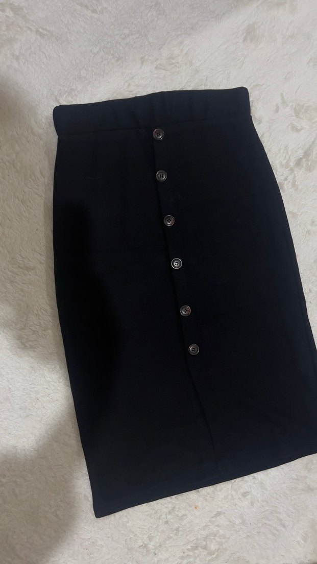 Düğmeli ön kısmı ve normal kesimiyle siyah midi hamile eteği, yumuşak sentetik kumaştan üretilmiştir. Ofis için uygundur, gotik tarzda.