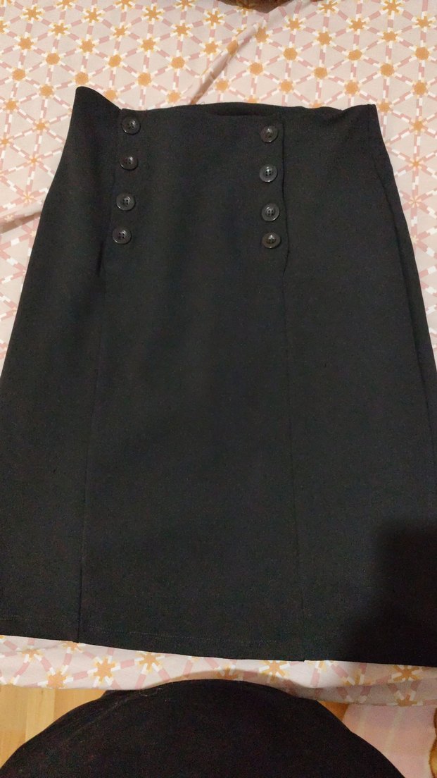 Düğmeli tasarıma sahip siyah midi hamile eteği, düz ve normal kesimdir. Ofis için uygun, gotik tarzda ve sentetik kumaştan üretilmiştir.